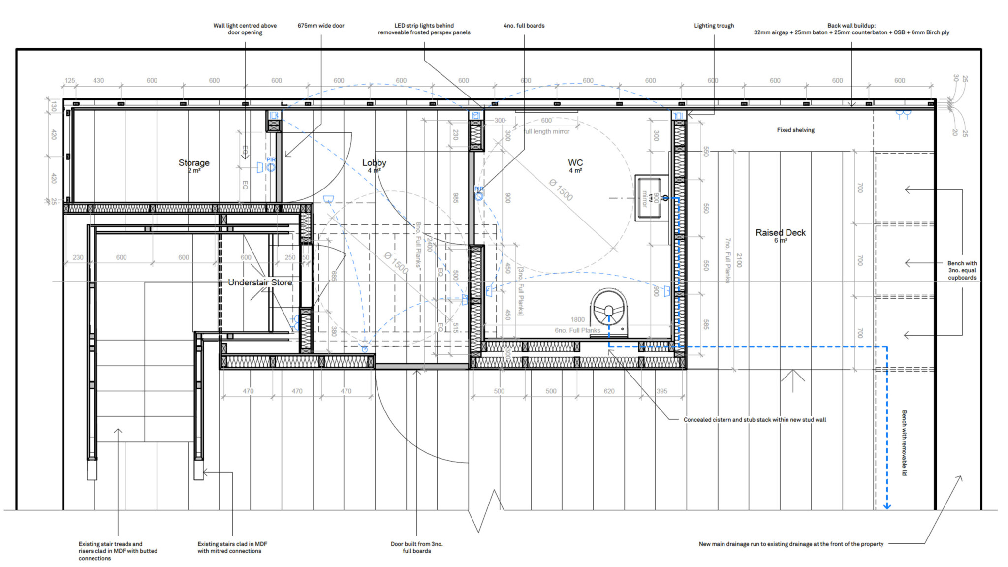 With the arch dug into a porous chalk cliff, we created an inventive drainage system above the timber structures to channel any water ingress down into the basement and out into the harbour.