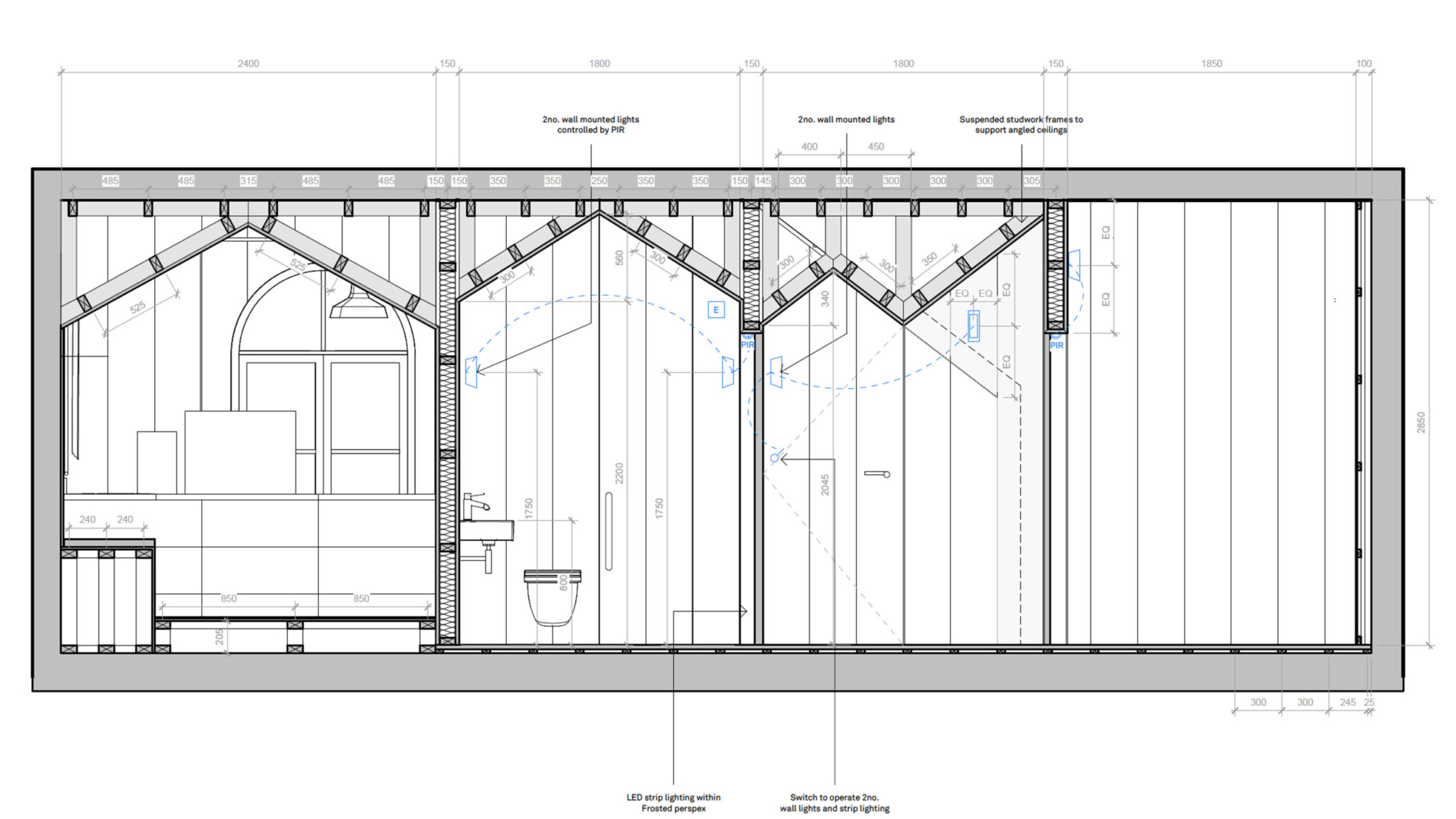 These interventions draw on the seaside location in their form, with bathing-hut pitched roofs, and Scandinavian influences with the choice of a single natural material throughout: birch plywood.