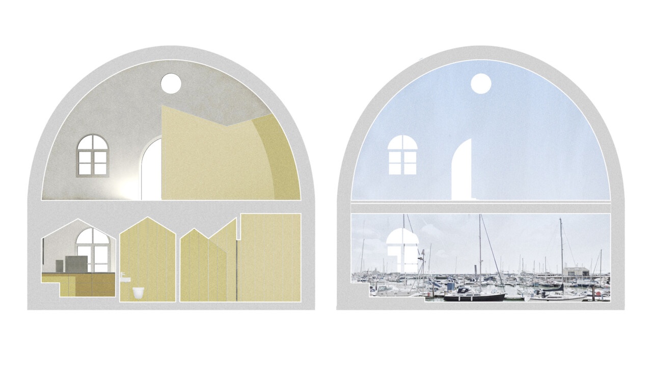 With all of the insertions located at the back, the front of the space is opened up to take full advantage of the single-aspect views – through a series of arched openings in the front wall – across the yacht marina.