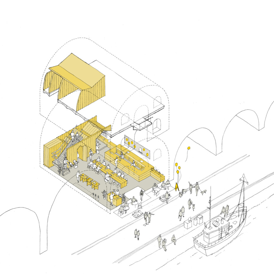 A harbour arch at Ramsgate, fitted with plywood interventions for re-use as a Scandinavian lifestyle store and community space.InsidePlayTimberUK