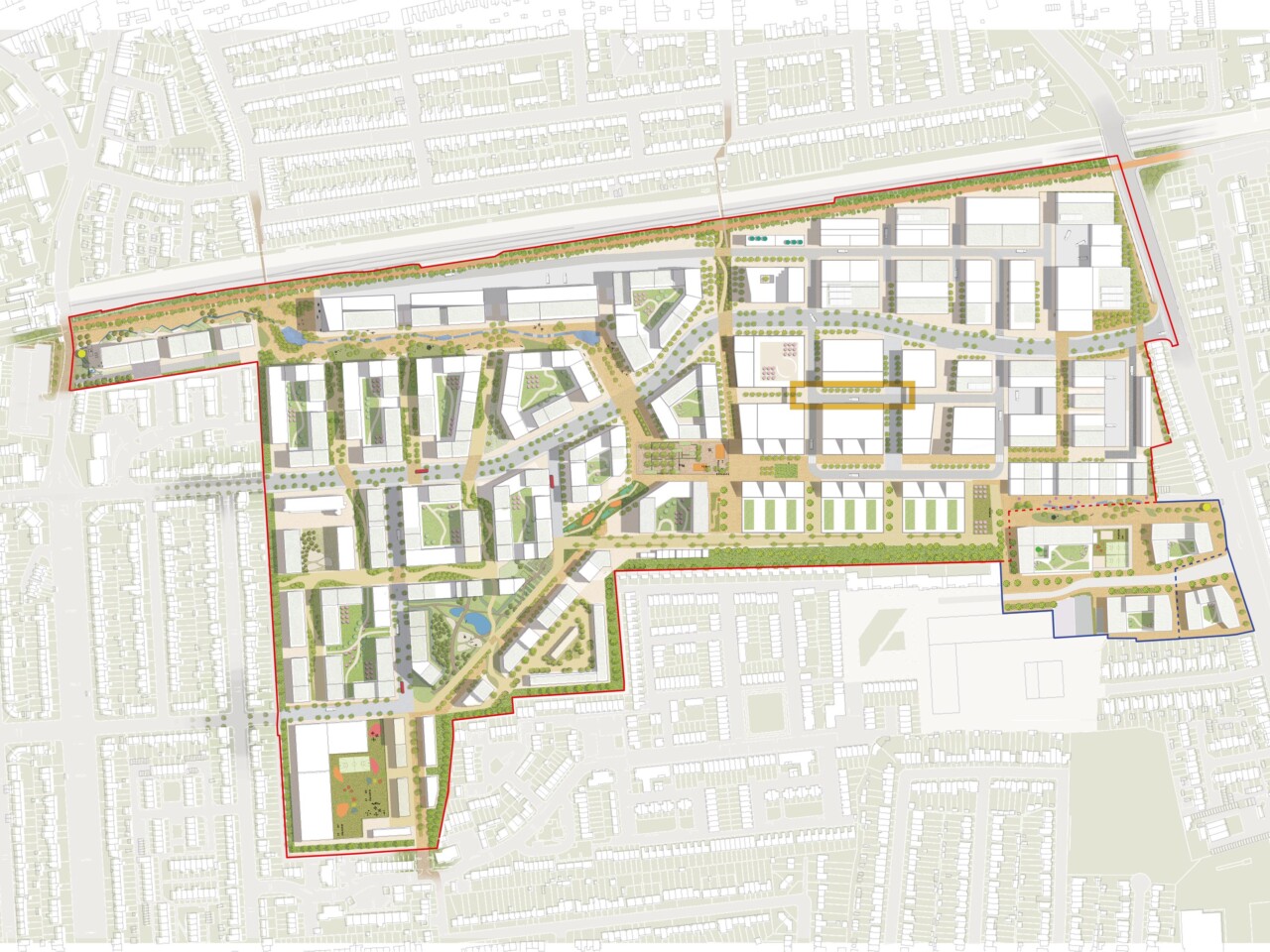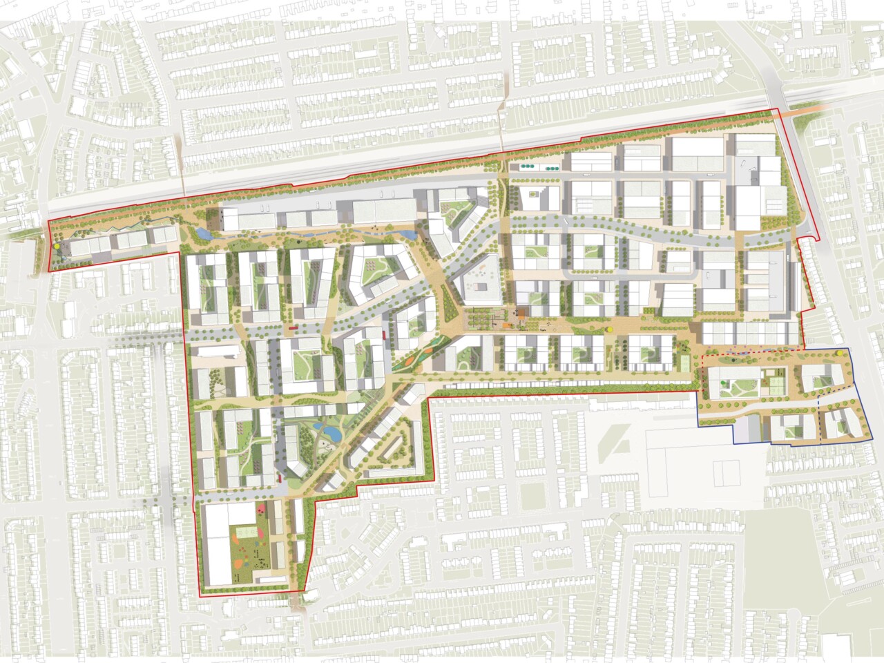 Green arteries, with pocket parks and squares, will converge at a market square, extending out to local transport hubs – including a new Crossrail station.
