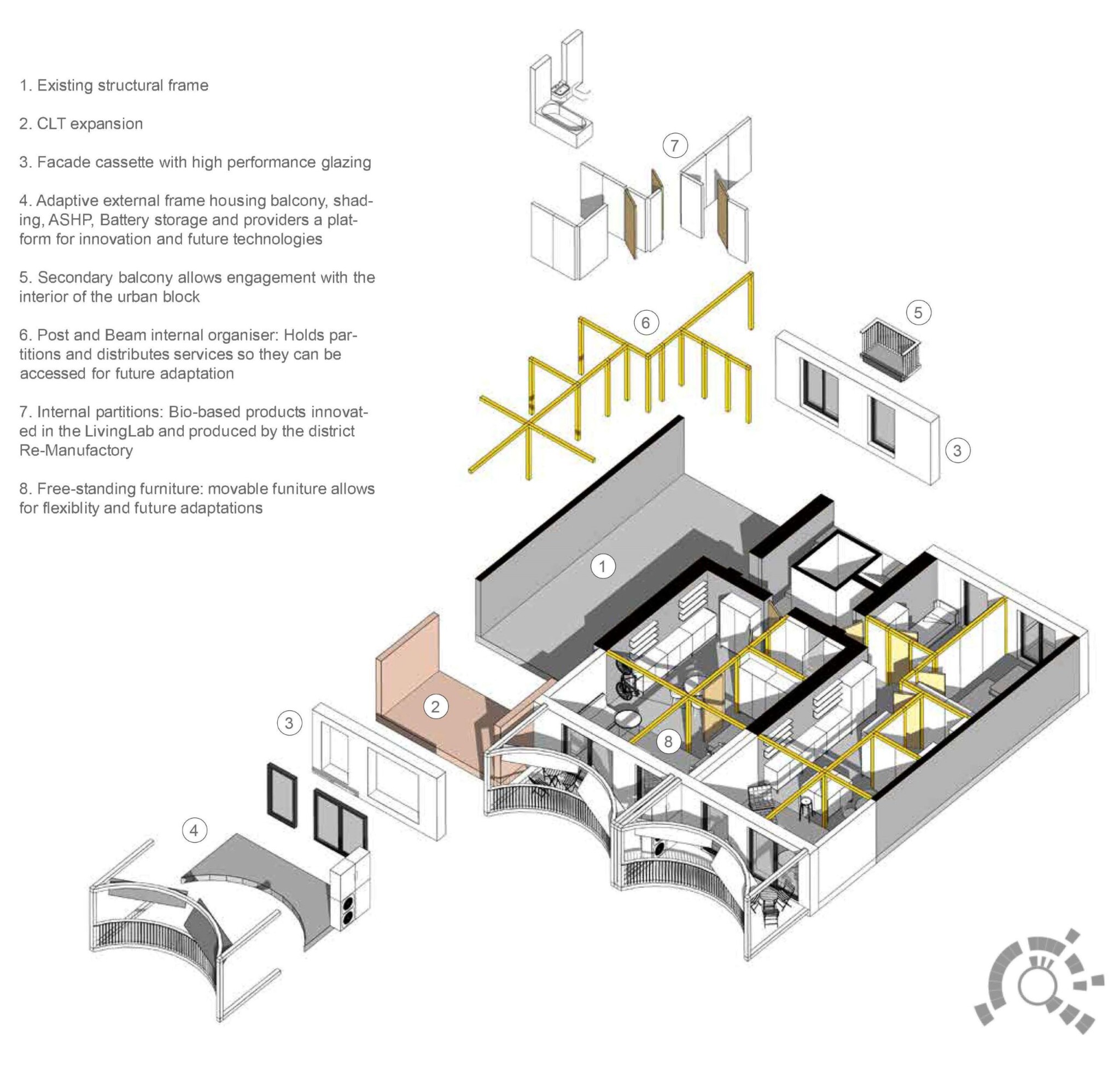 The material embedded in the existing buildings, as well as the new components which are designed in demountable layers, are ascribed genuine financeable value. This value is gained from income generated through a subscription model in which manufacturers retain ownership and responsibility for the products’ performance during and beyond any conventional lifecycle.