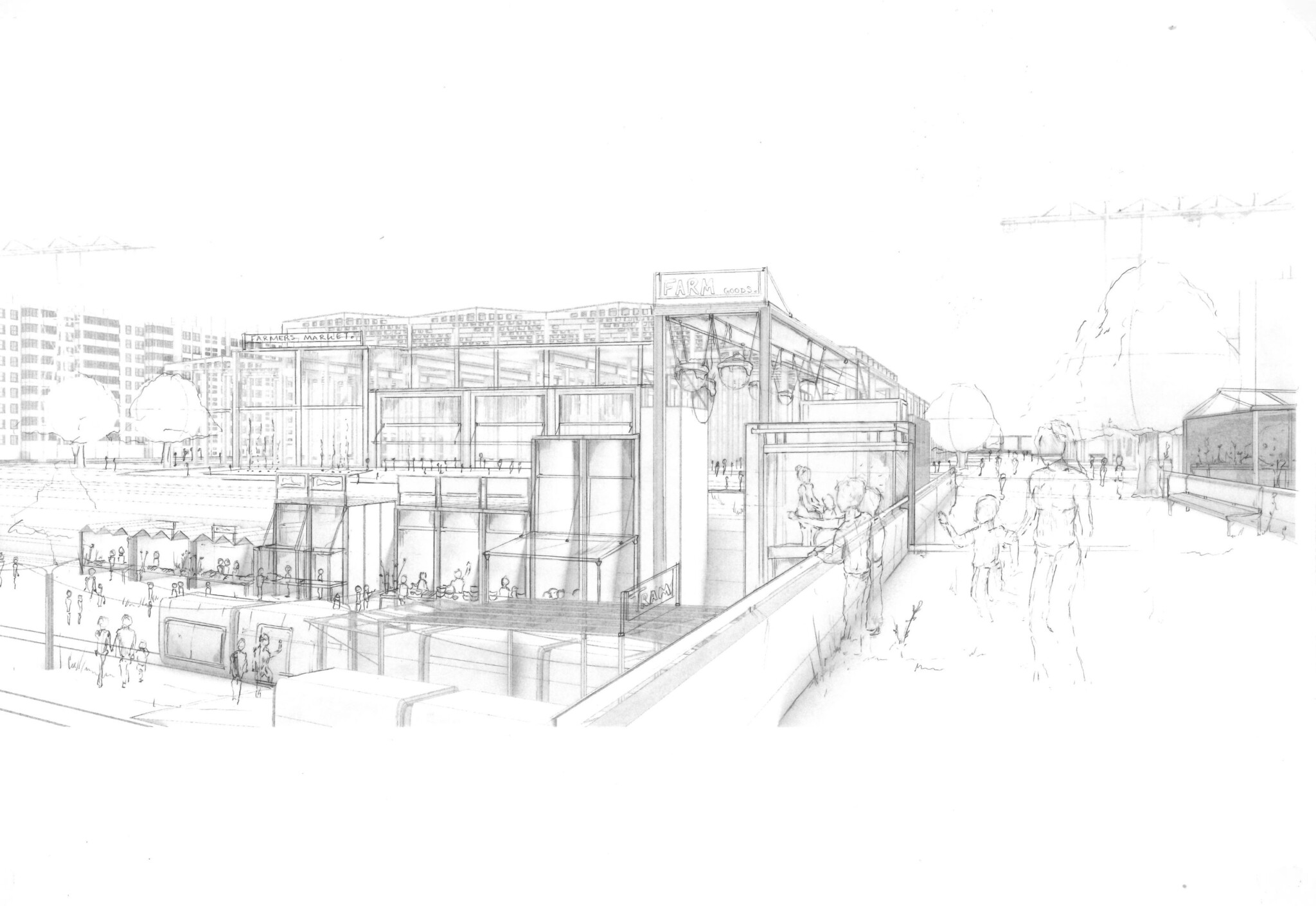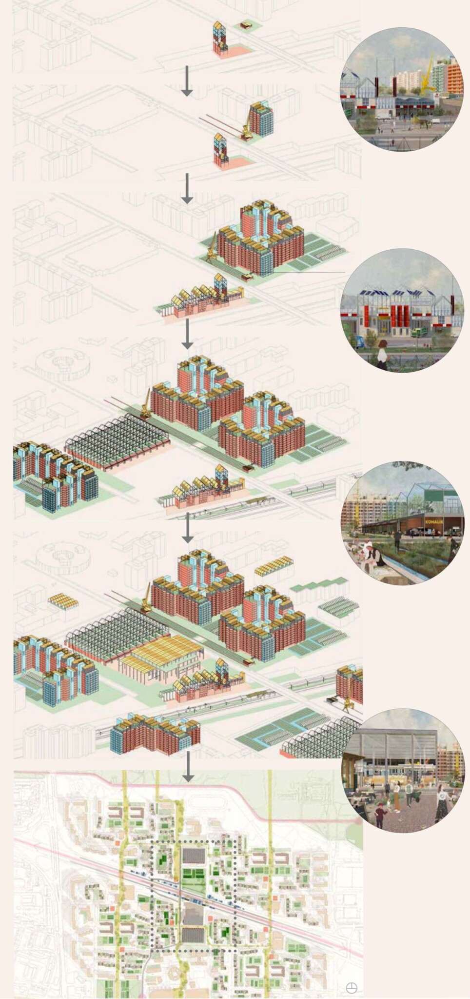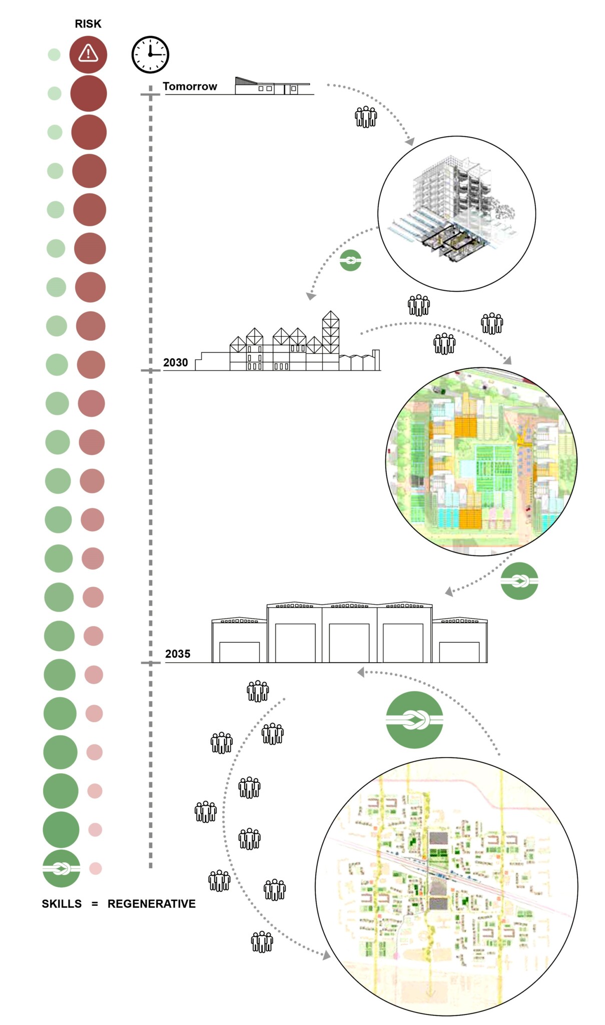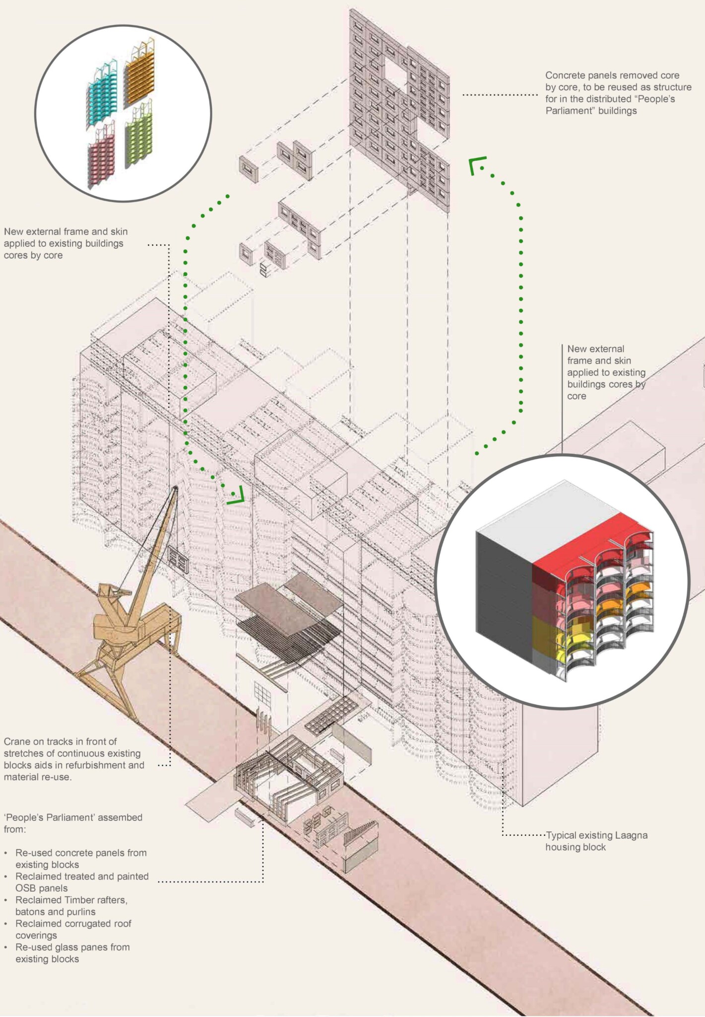 At the civic heart of Laagna, a Re-Manufactory is proposed, composed of repurposed industrial buildings from elsewhere. Here, materials removed from existing buildings and biomatter from its landscape are processed and stored. Adjacent, an urban farm and food market grows and distributes food whilst providing a strong social focus for the district.