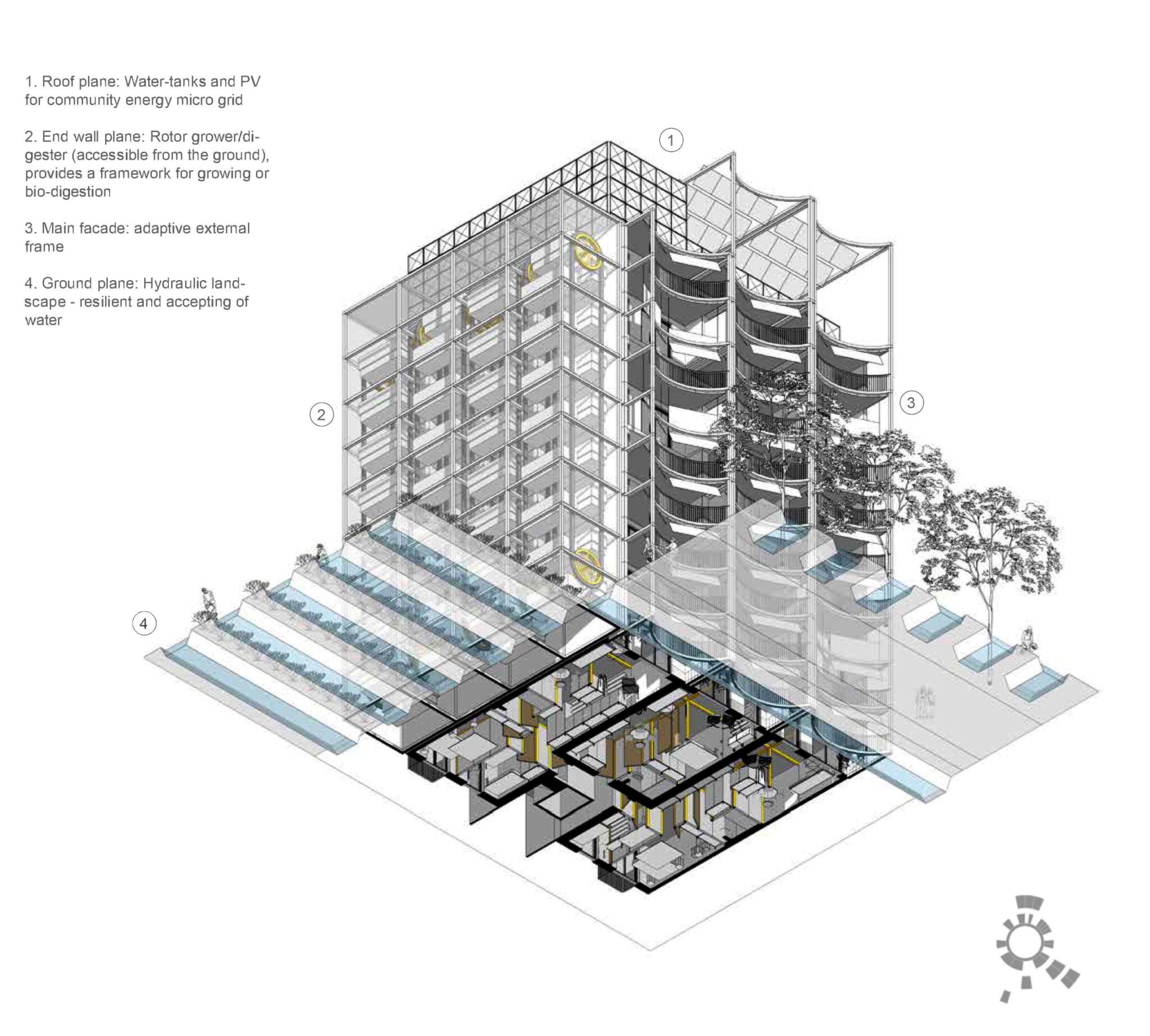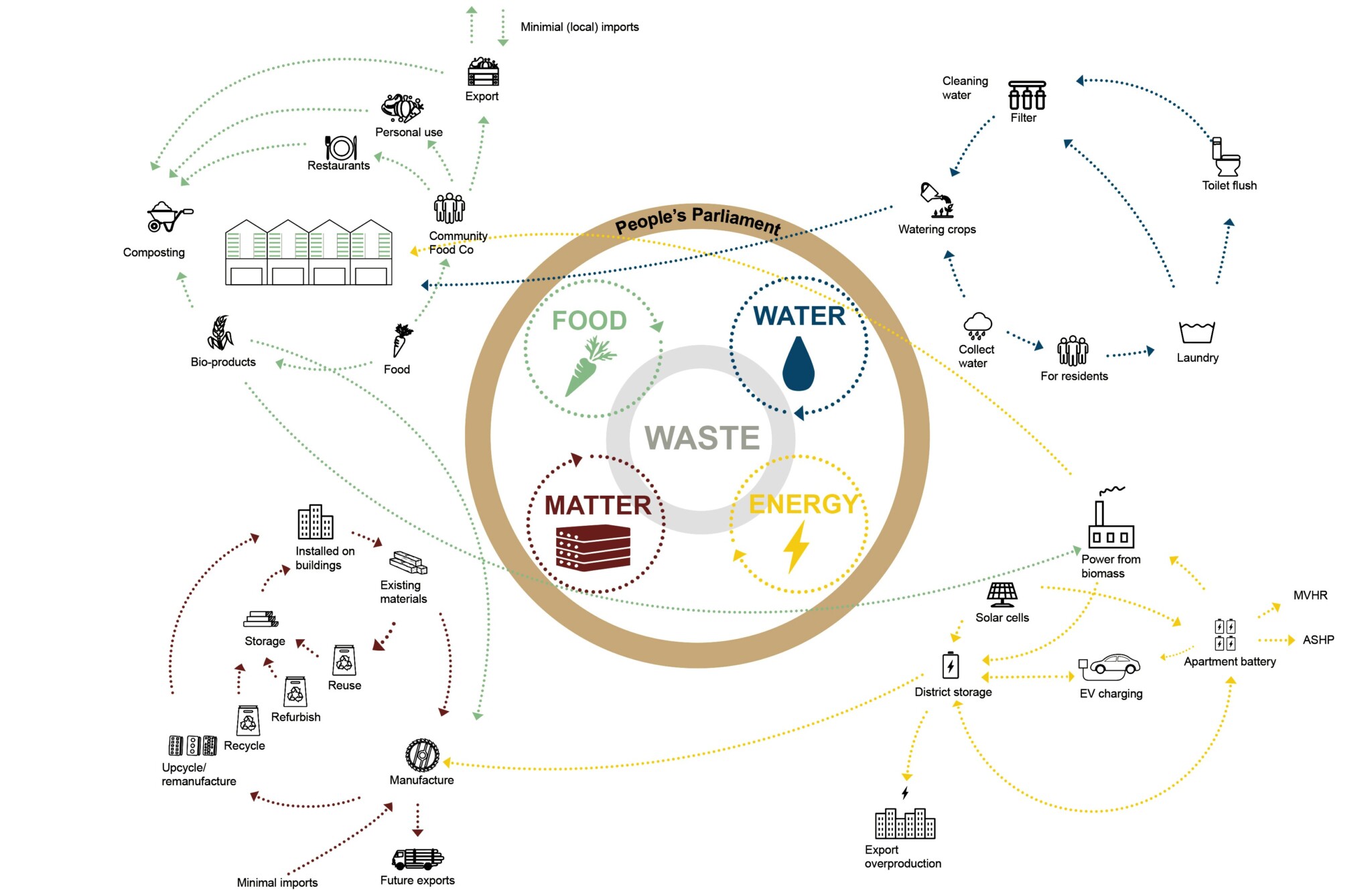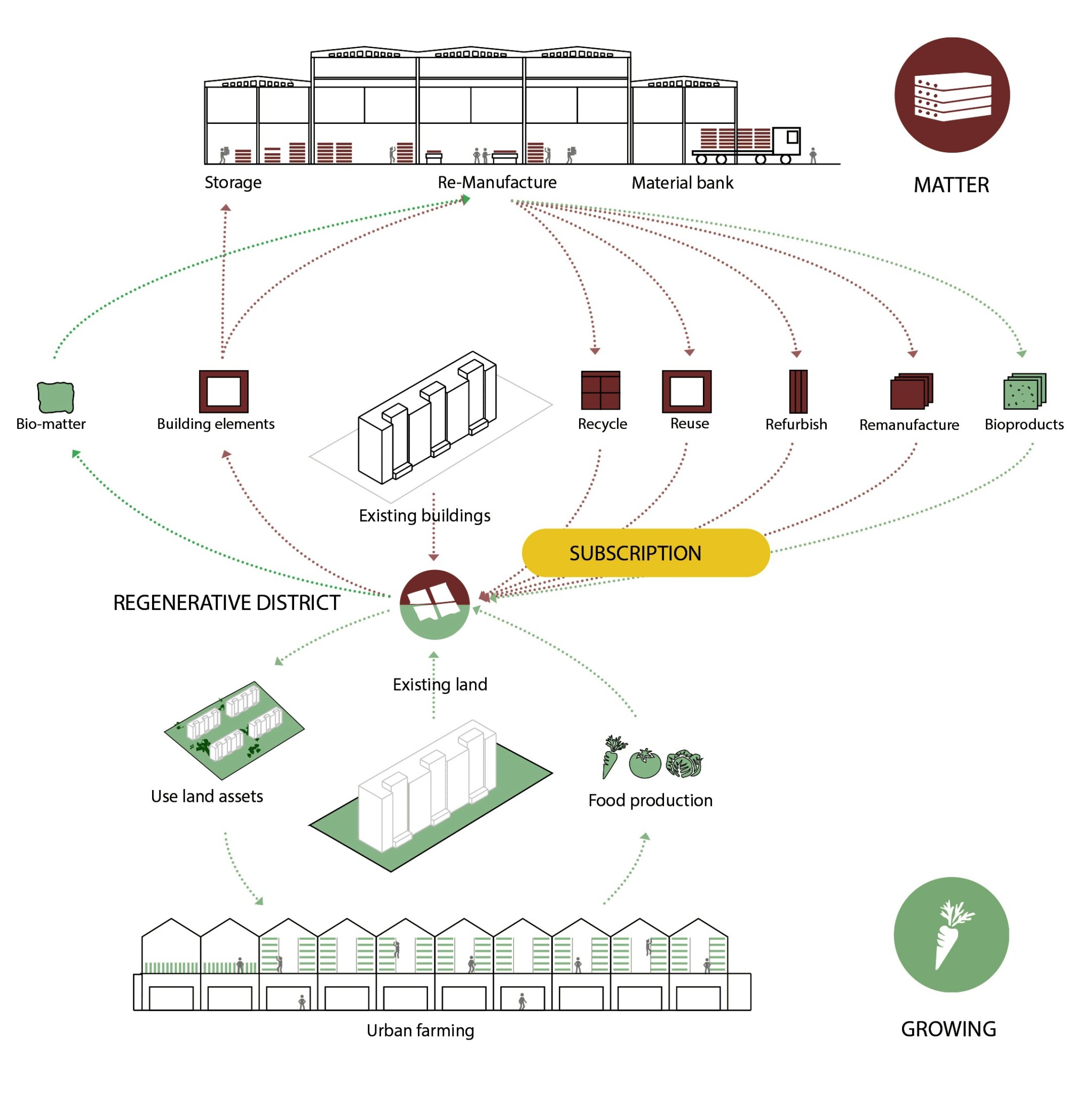The project was designed using donut economics across all scales of development, from the masterplan to the individual housing blocks. In doing so, our proposal considers all four topics: Food, Energy, Waste, Matter, presenting a holistic vision for a circular district.