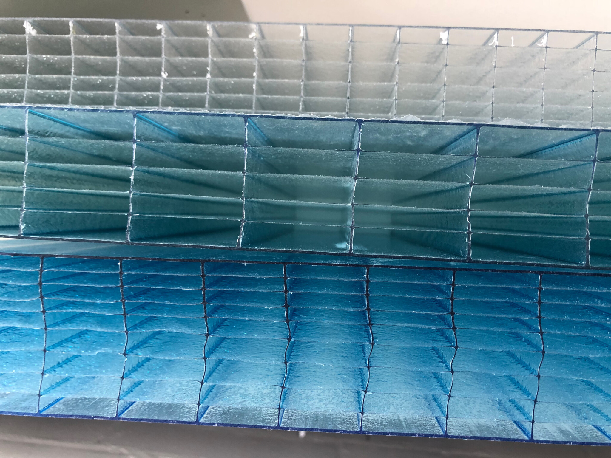 The blue tone of the polycarbonate reflects the landscape of fjords and mountains, blending into the clear sky.