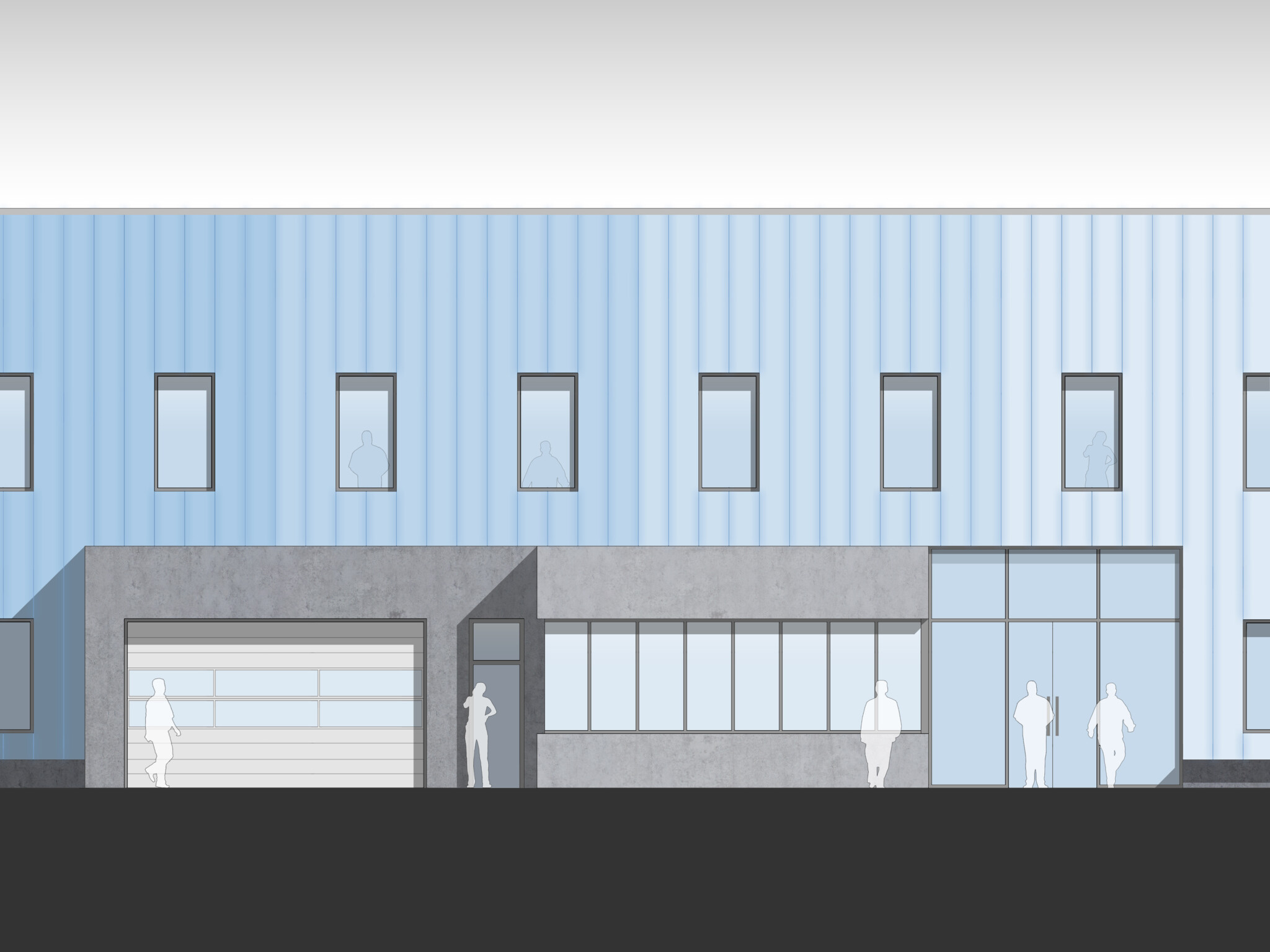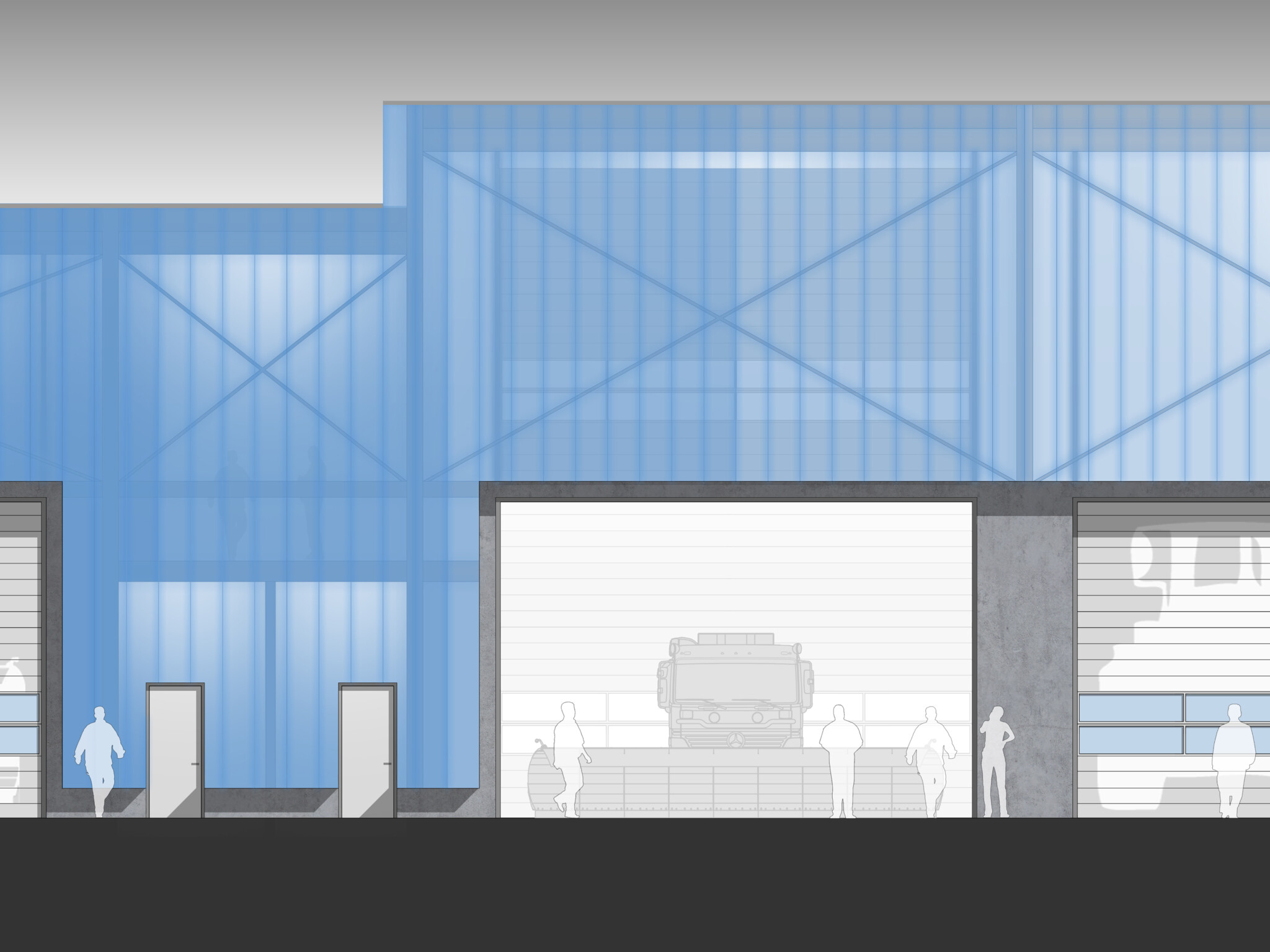 The polycarbonate lets a diffuse light into the garages and workshops inside, creating a high quality working environment.