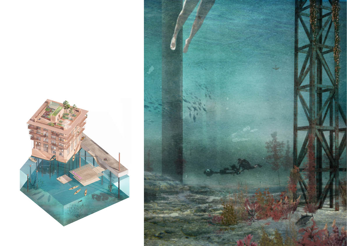 Above water, the development is built using either contemporary timber structures, or recycled building elements, such as reclaimed bricks or recycled steel sections.