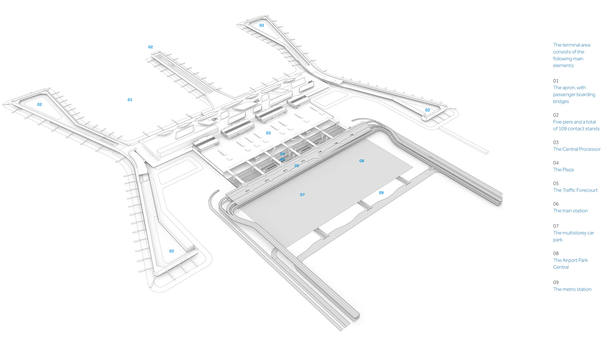 Our key decision was design a single, crab-shaped terminal, so that the large number of gates (more than 90 in total) are within a reasonable walking distance, a fundamental consideration in airport design.
