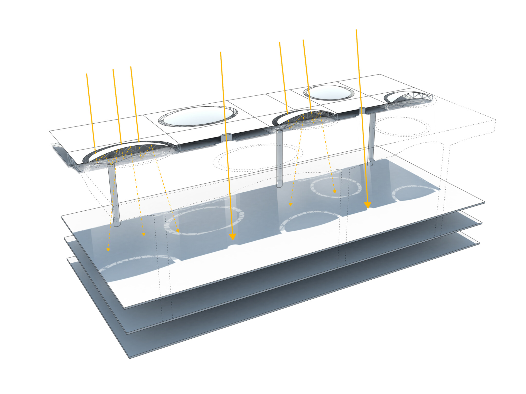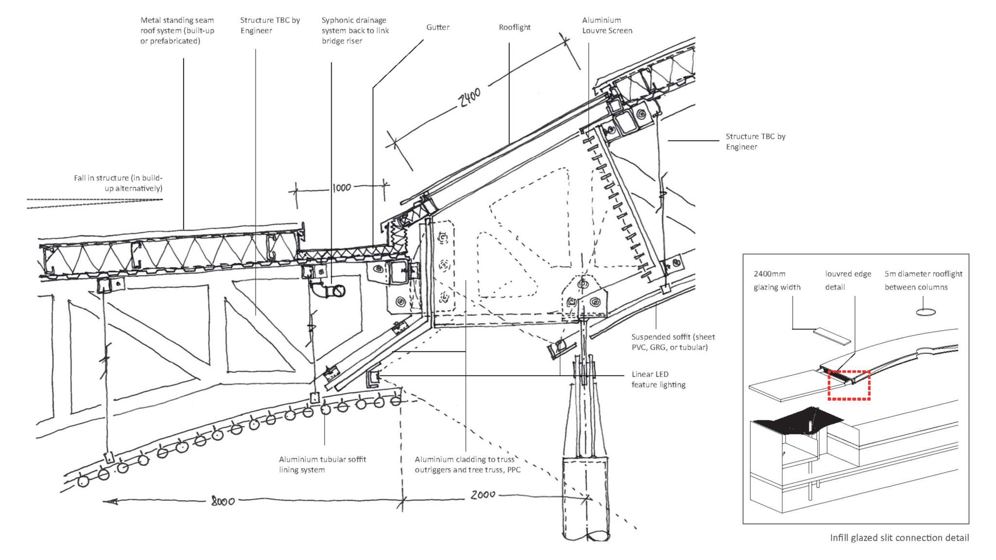 The main roof structure was built to simple structural principles, using aluminium profiles to give the complex curves needed for the barrel vaulting.
