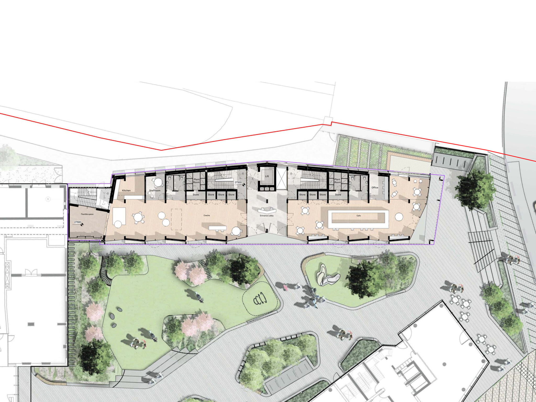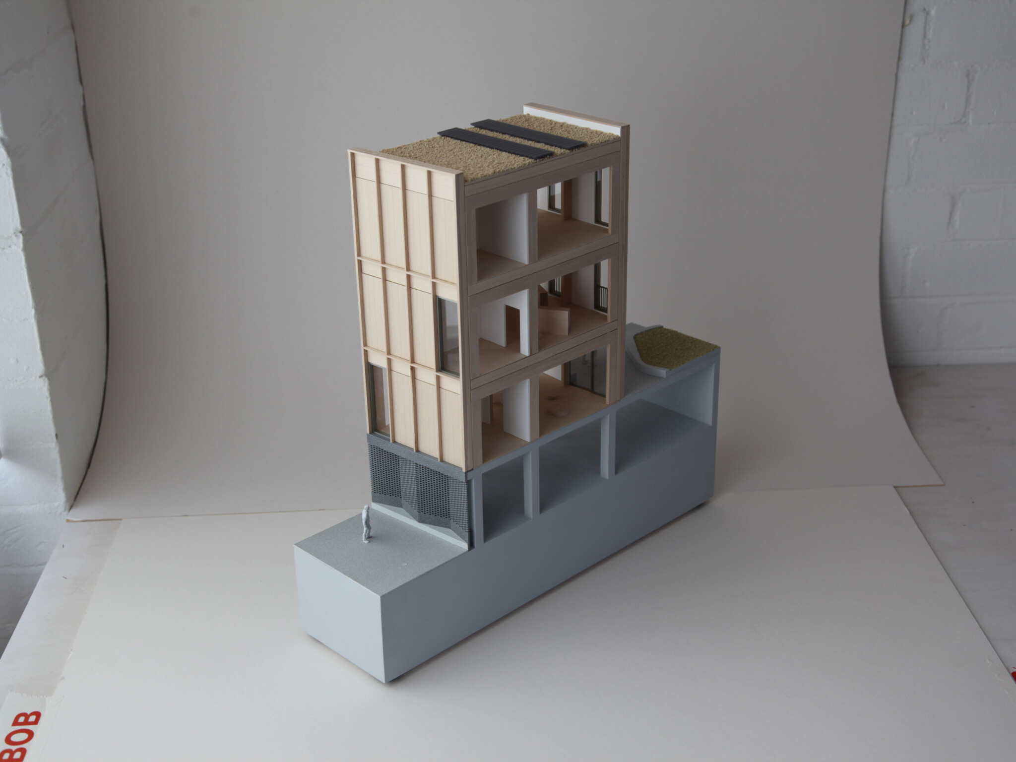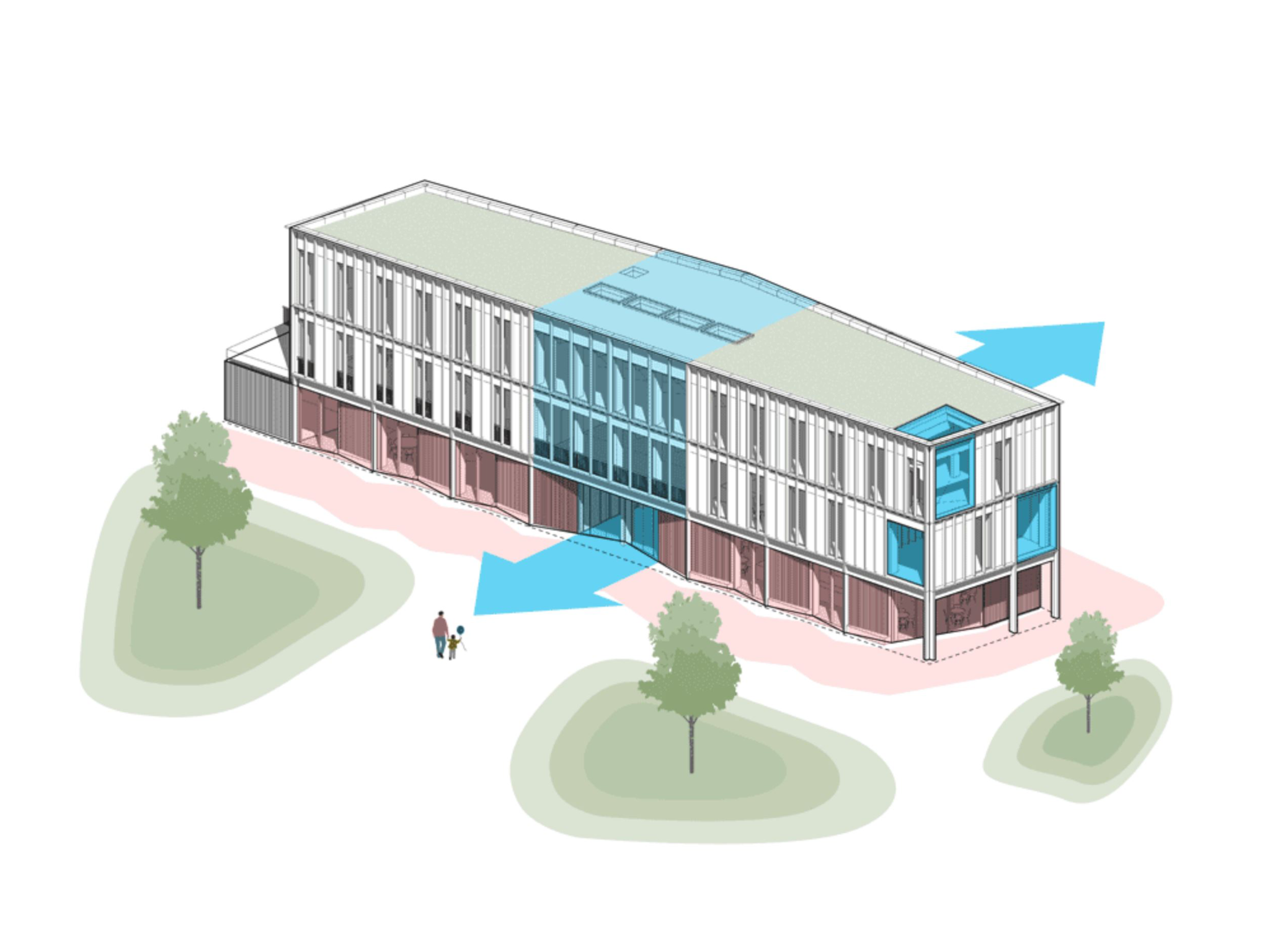 Our brief was to create a community building that would be fully accessible to all of its neighbours, with a mix of uses including a café, gym studios and a creche.