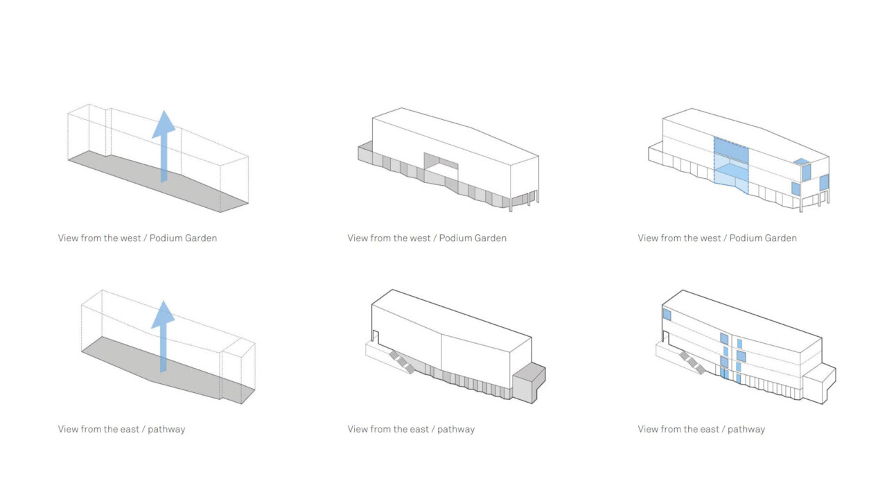 It sits between two new green spaces, so has been designed to integrated seamlessly with these. The ground floor is open and transparent, with movable screens and a concertina wall opening onto the adjoining gardens.