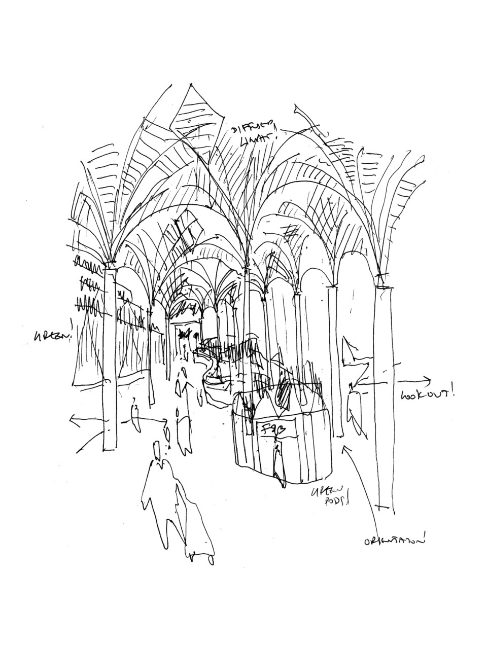 Inside, the ‘flower petal’ columns support a series of vaults and create a sense of directionality, leading passengers through the airport from landside to airside.