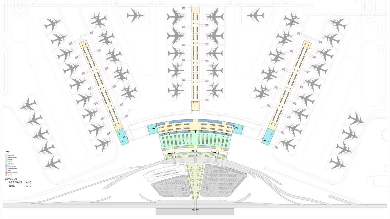 With a generous piazza and traffic forecourt placed landside, the terminal seamlessly integrates with the wider airport masterplan, and connections by rail, bus, coach and car.