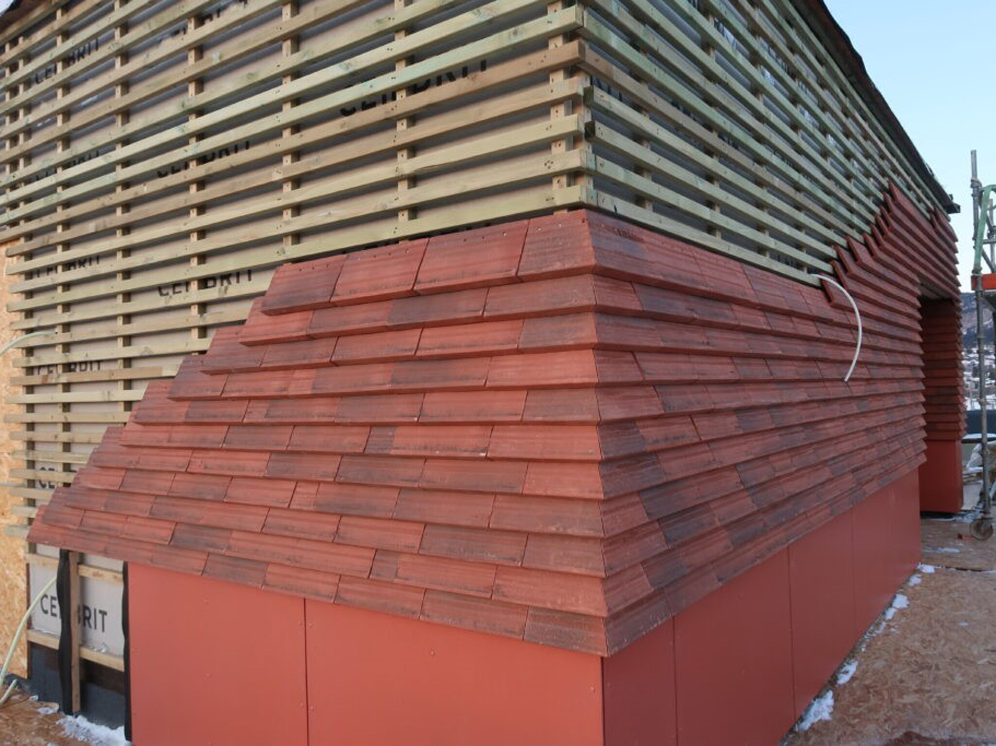 The red shingles selected for the exterior give the strong sense of texture, depth and warmth.