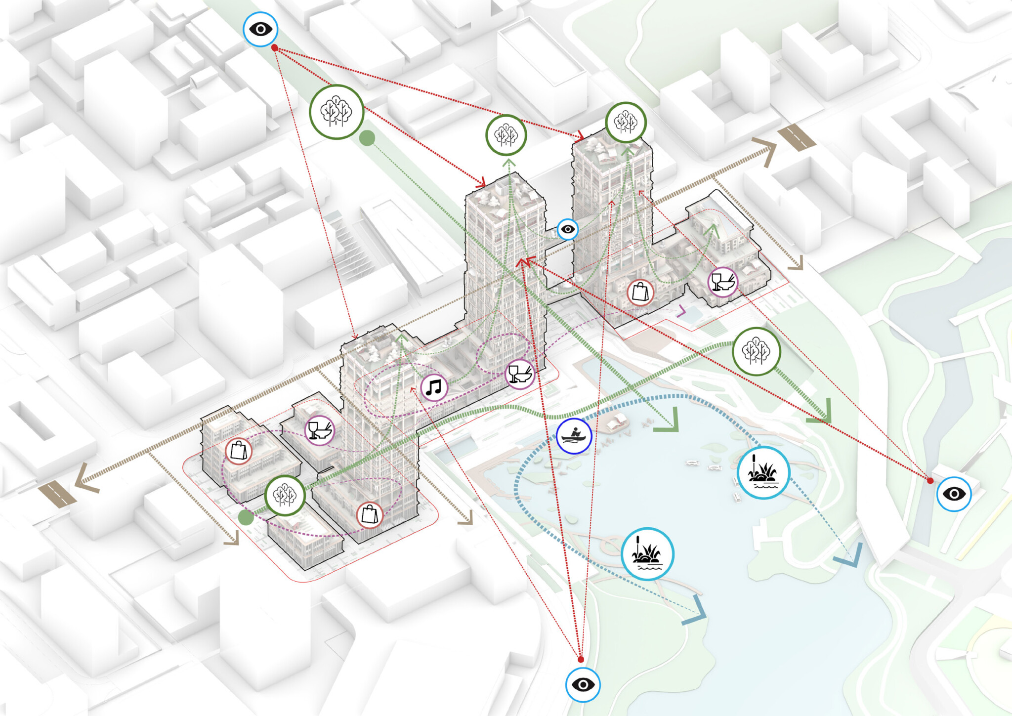Local flora and fauna are also used across each area to enhance and extend the Central Eco Valley, green corridor, into a lush wetland around Wenli Lake and throughout the urban podium park, public realm and vertically up the terraced gardens a part of the buildings.